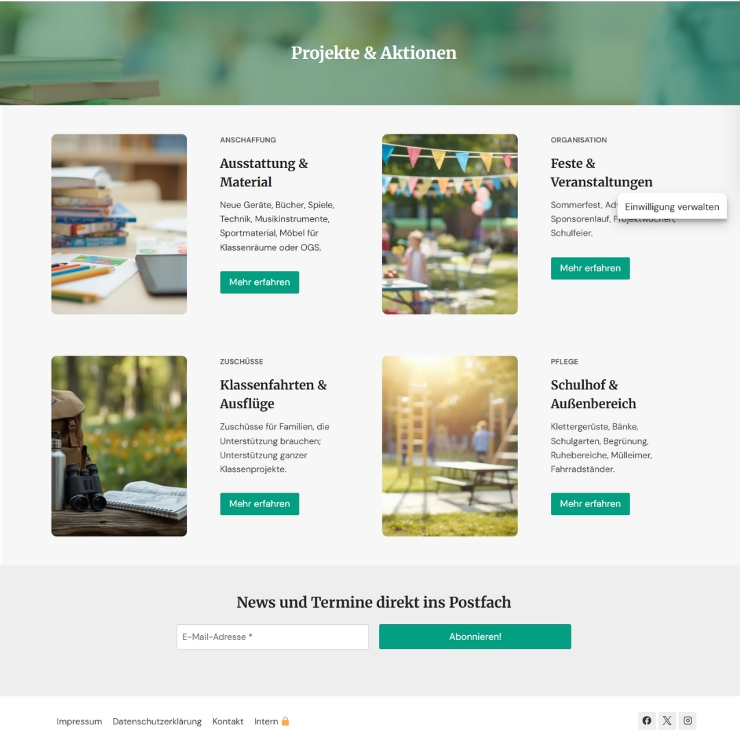 Dann nochmal die Kurzeinstiege, falls man das Menü bis dahin übersehen hat. Alles steht dort, wo man es erwartet, ohne lange suchen zu müssen. Jede Sektion hat ihren eigenen Platz, und die Seite führt Besucher Schritt für Schritt durch das, was euren Verein ausmacht.