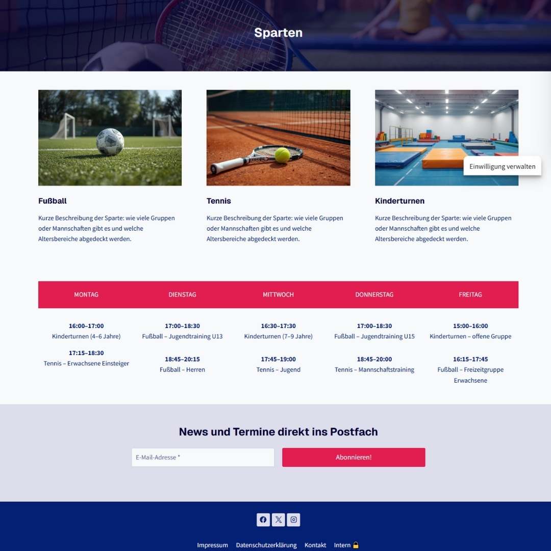 Damit du ein Gefühl dafür bekommst, wie eine Vereinswebsite in WordPress wirken kann, schauen wir uns einmal eine fertige Startseite eines Sportvereins an. Du brauchst dafür kein Fachwissen – du siehst einfach, wie Besucher eure Inhalte später erleben.